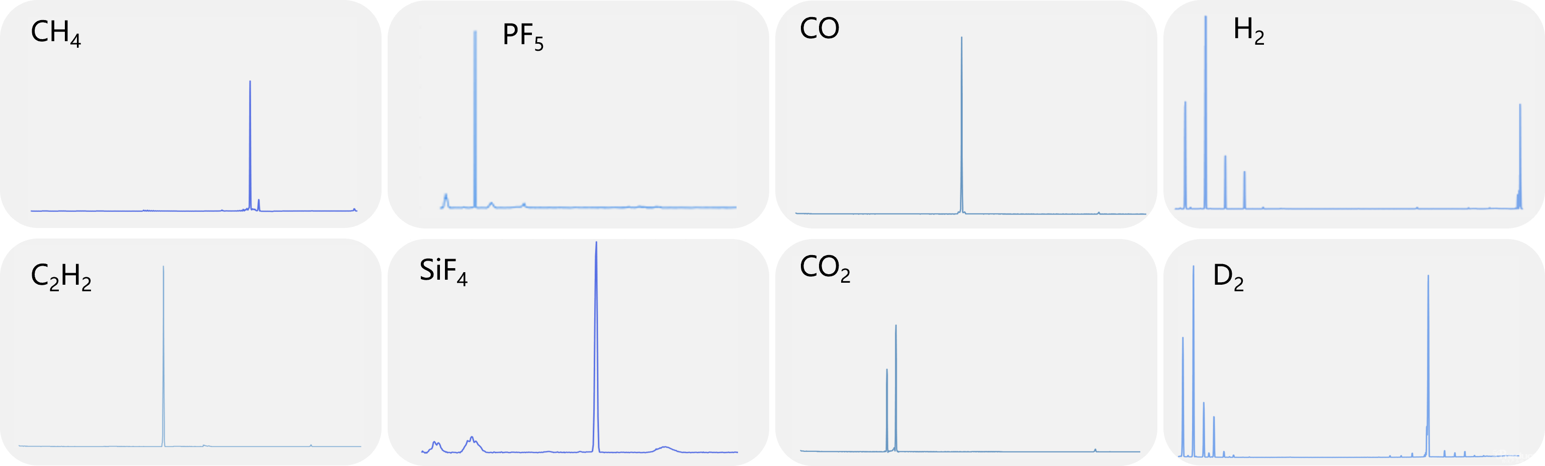 測量氣體 | CH4、C2H6、C3H8、H2、DMK等碳氫化合物 PF5、HCl、PF3、POF3等腐蝕性氣體 N2、O2、CO2、CO、H2S等大氣組分 H2、D2、T2、HD、HT、DT等同位素氣體 |